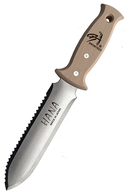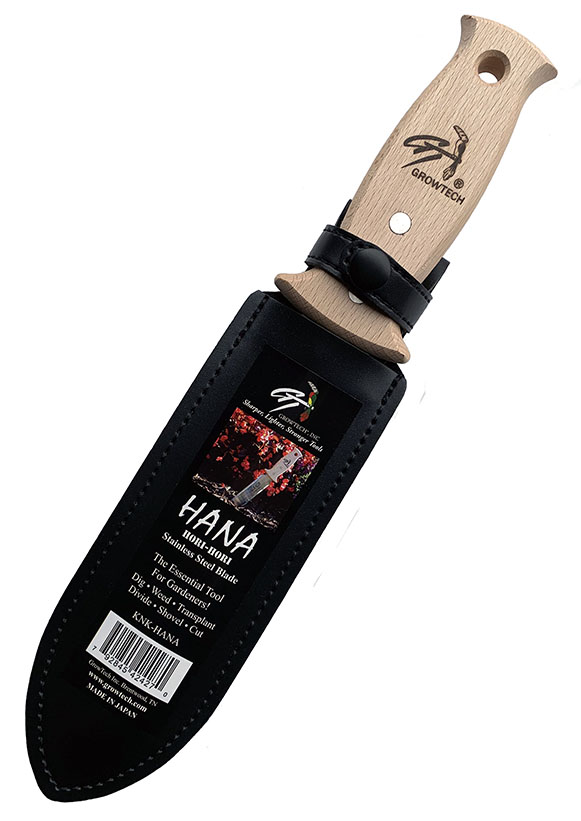 Description: Hori-Hori means “dig-dig”! These knives are multipurpose – weed, plant, divide perennials, even cut sod. They are beveled for shoveling and have a serrated edge for sawing. The blade is marked for depth measurement for easy planting. This tool has become a favorite amongst Master Gardeners! Reinforced vinyl sheath included.